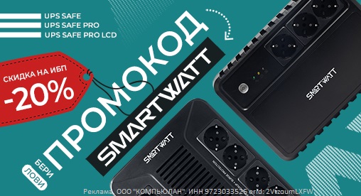 Скидка распространяется на источники бесперебойного питания серий UPS SAFE, UPS SAFE PRO и UPS SAFE PRO LCD от SMARTWATT*, что позволит вам существенно сэкономить на покупке качественных устройств для защиты домашнего, офисного или торгового оборудования.