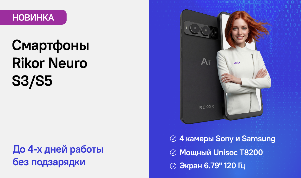 В ассортименте KNS появились новые смартфоны российского бренда RIKOR — модели NEURO S3 и NEURO S5. Смартфоны работают на Android 15, обладают продвинутой системой камер и построены на энергоэффективном 8-ядерном процессоре UNISOC Tiger T8200. Это обеспечивает достаточную производительность в приложениях, играх и многозадачности при оптимальном энергопотреблении.