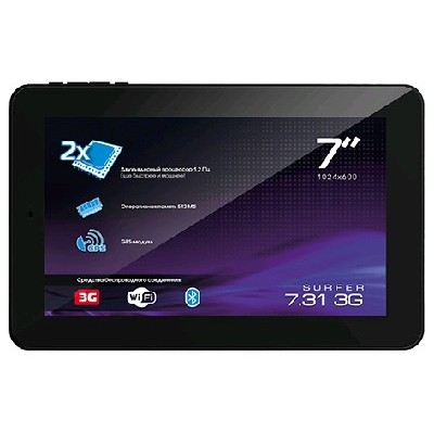 Explay Surfer 7.31 3G Black - планшет с ярким емкостным мультитач TFT дисплеем размером 7" и разрешением 1024x600 станет отличным помощником как дома, так и в поездках. Благодаря 2 ядерному процессору Cortex A9 1200 МГц и оперативной памяти 0.5 Гб он с легкостью справится со всеми повседневными задачами, а встроенного внутреннего накопителя объёмом 4 Гб хватит для работы с необходимыми приложениями. Книги, музыку и другие персональные данные можно хранить на подключаемой карте памяти стандарта microSDHC емкостью до 32 Гб. Гаджет обладает ёмким аккумулятором на 3000 мАч, что обеспечит до 6 часов непрерывной работы. С помощью камеры с разрешением 2 Мп Вы сможете делать снимки и записывать видео, а наличие фронтальной камеры с разрешением 0.3 млн пикс. добавит удобства в видео конференциях и съемках селфи. Доступ в интернет можно получить через сеть Wi-Fi или 3G. Планшет Explay Surfer 7.31 3G Black, изготовленный из качественного и прочного материала с размером 192x122x10 мм, удобно держать в руках, а предустановленная операционная система Android 4.0 позволит Вам в полной мере использовать совместимые с ней приложения.
