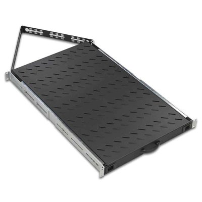 19" 1U выдвижная усиленная универсальная полка для напольных и настенных шкафов глубиной 1000 мм, нагрузка 50 кг, 4 точки крепления, с телескопическим органайзером, цвет черный, LN-RAF-HRA-D100-BL