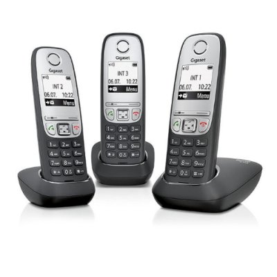 комплект из базы и 3 трубок, поддержка стандартов DECT/GAP, громкая связь (спикерфон), определитель номеров (АОН/Caller ID), аккумуляторы: AAAx2, монохромный дисплей на трубке