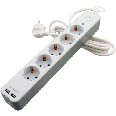 5 розеток, длина кабеля 3 метров, максимальная нагрузка 3680 Вт, максимальный ток нагрузки 16 A, защита от короткого замыкания, 2 USB порта для зарядки, цвет белый