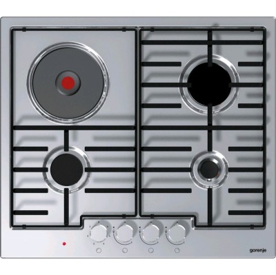 Тип: встраиваемая комбинированная панель, размеры: 10.7х60x53, материал поверхности: нержавеющая сталь, конфорки: 3 газовых и 1 электрическая чугунная